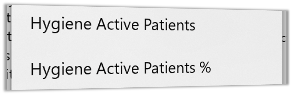Hygiene Active Patients: will track the practice’s active patients who have been see by the hygiene department.